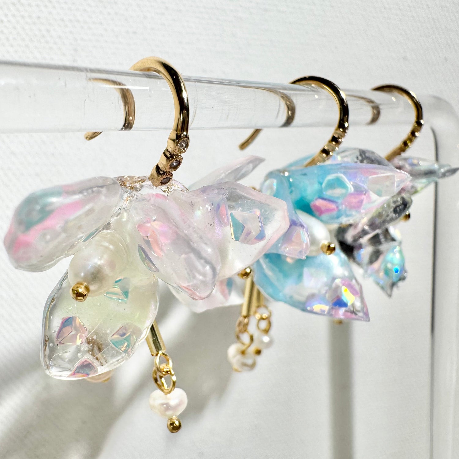 As the earrings sway, hints of light reflect across the petals, giving them a lively, airy presence. A small pearl drop adds a subtle movement that brings balance and charm to the design.