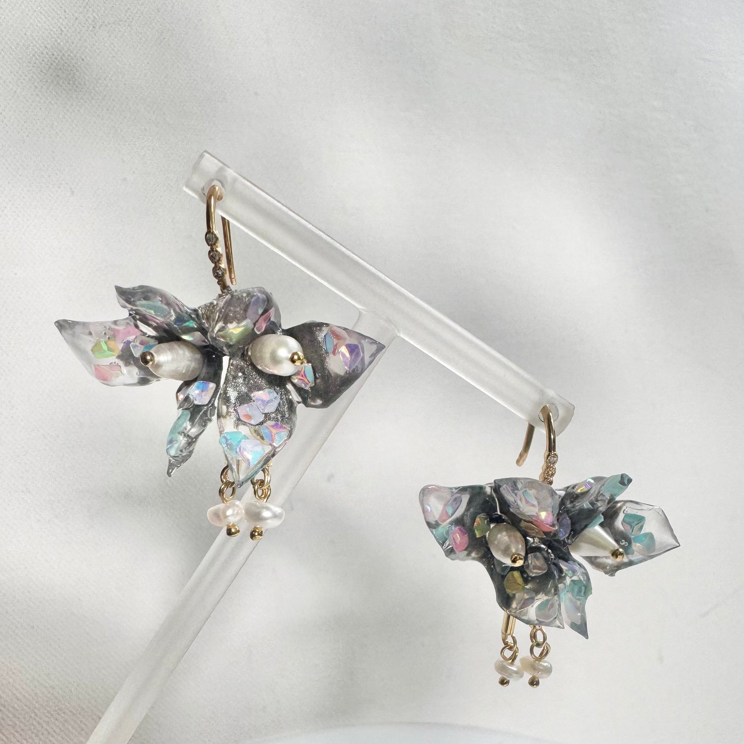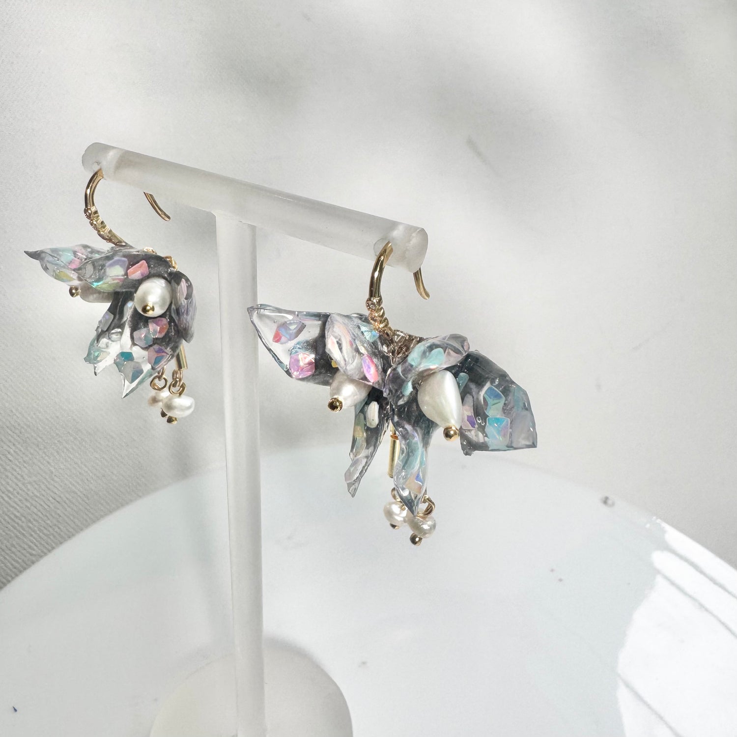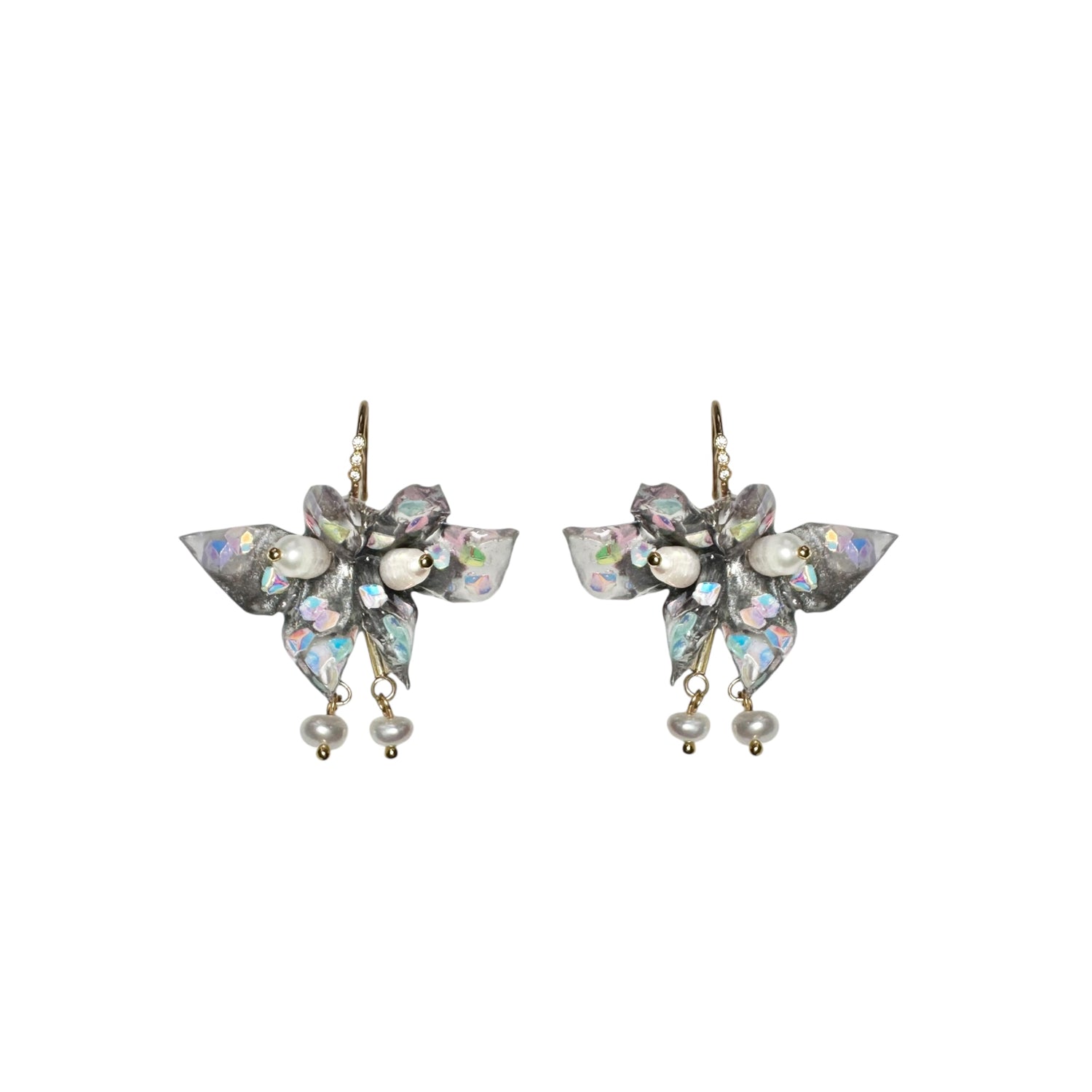 The layered wings are formed with shimmering petals, finished with transparent edges that catch and reflect light as you move.