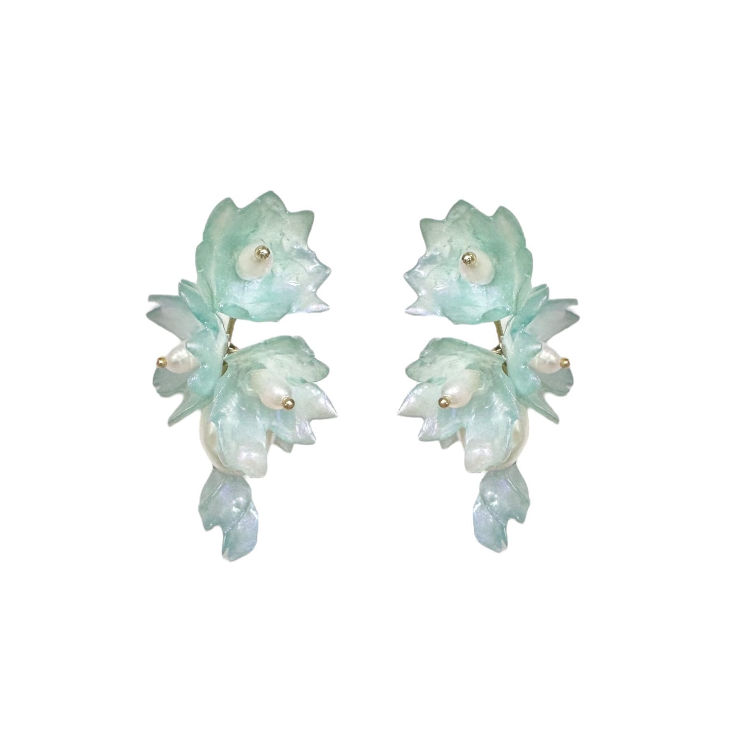 These earrings bring the fresh, peaceful feeling of a clear spring morning. The layered petals in this gentle airy blue tone have a subtle iridescent shimmer that glows when the light hits them, giving your whole look a cool, refreshing lift.