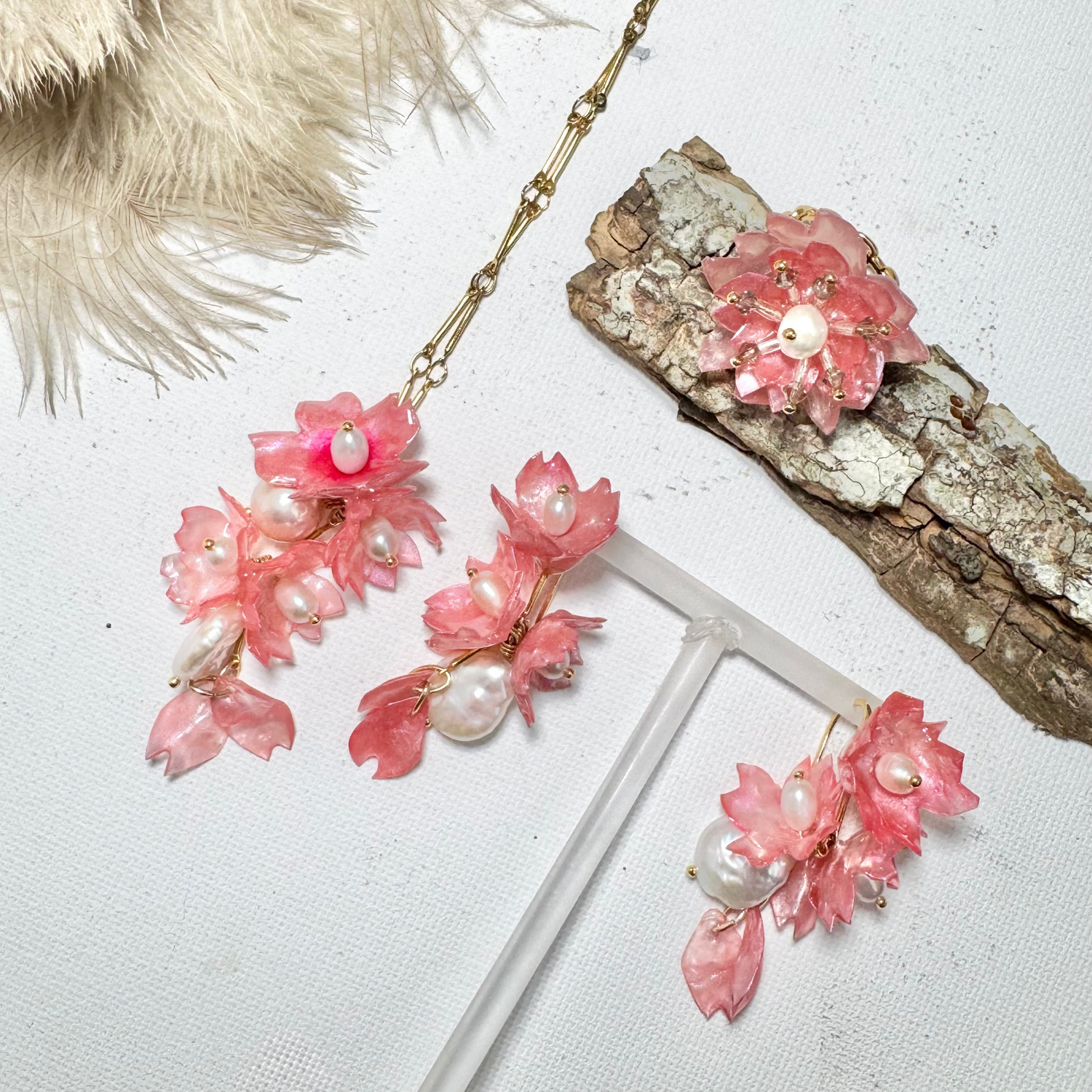 These earrings feel like the soft, glowing warmth of cherry blossoms in the early spring light. Layered in a rich cherry-blush tone with a gentle iridescent shimmer, they catch the light beautifully and move with a natural, romantic flow as you walk or turn your head.