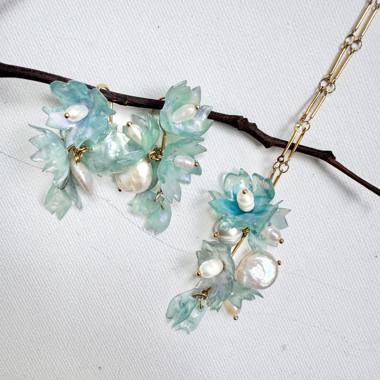 Formed with translucent blue petal-like elements and softly luminous pearls, this piece flows along the neckline with natural movement and elegance.