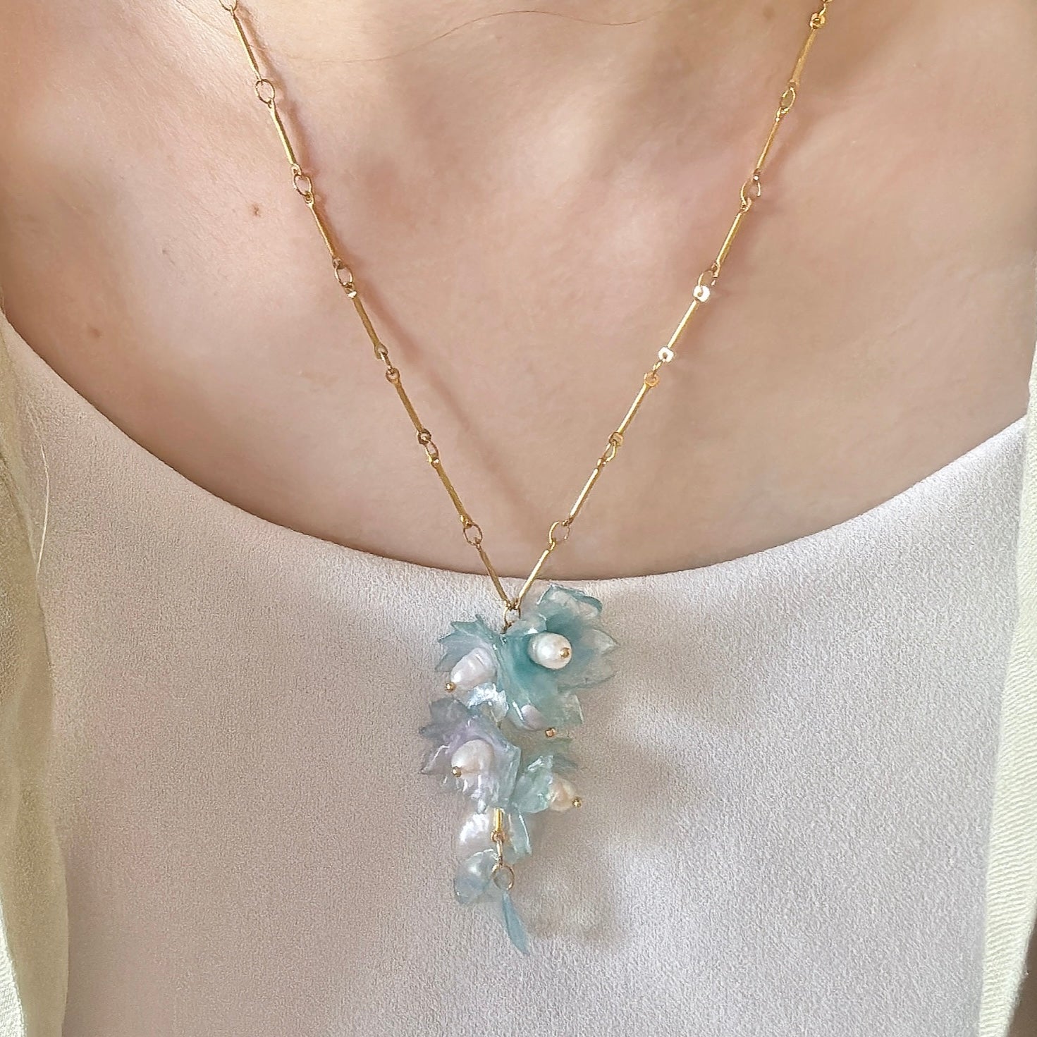 A delicate expression of spring, the Airy Blue Necklace feels fluid, light, and softly radiant—like petals carried through the air.