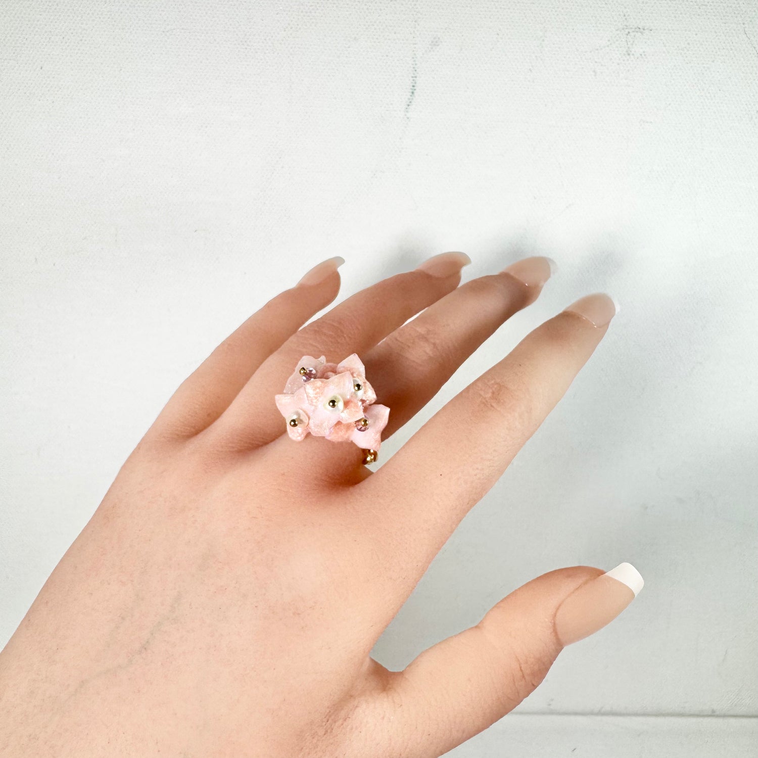 Hand-sculpted in pale pink tones, each petal curves delicately to form a floral silhouette that feels both natural and poetic.