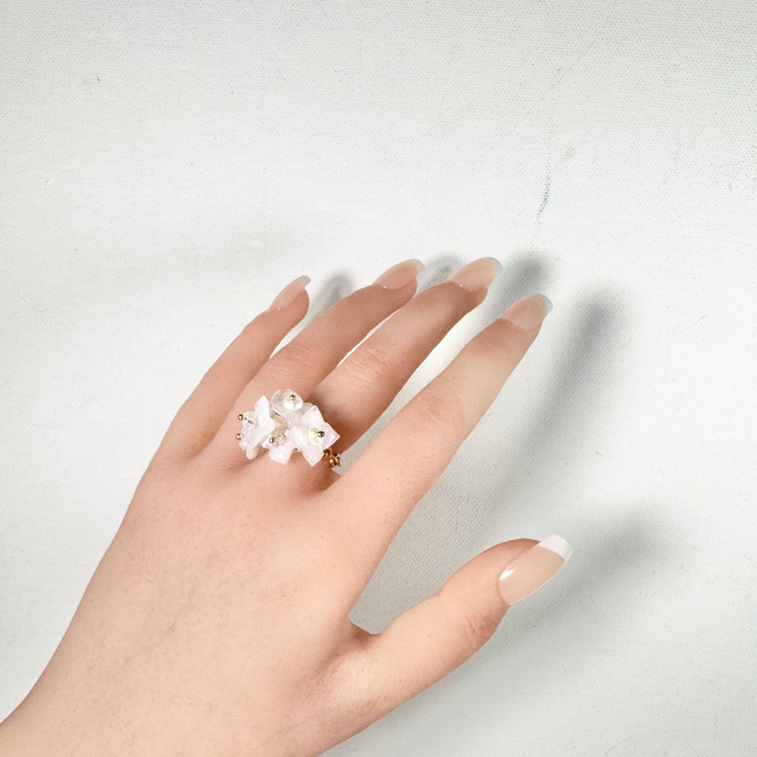 Each petal is delicately sculpted by hand in a soft, misty white, layered to evoke the natural bloom of a hydrangea kissed by gentle rain.